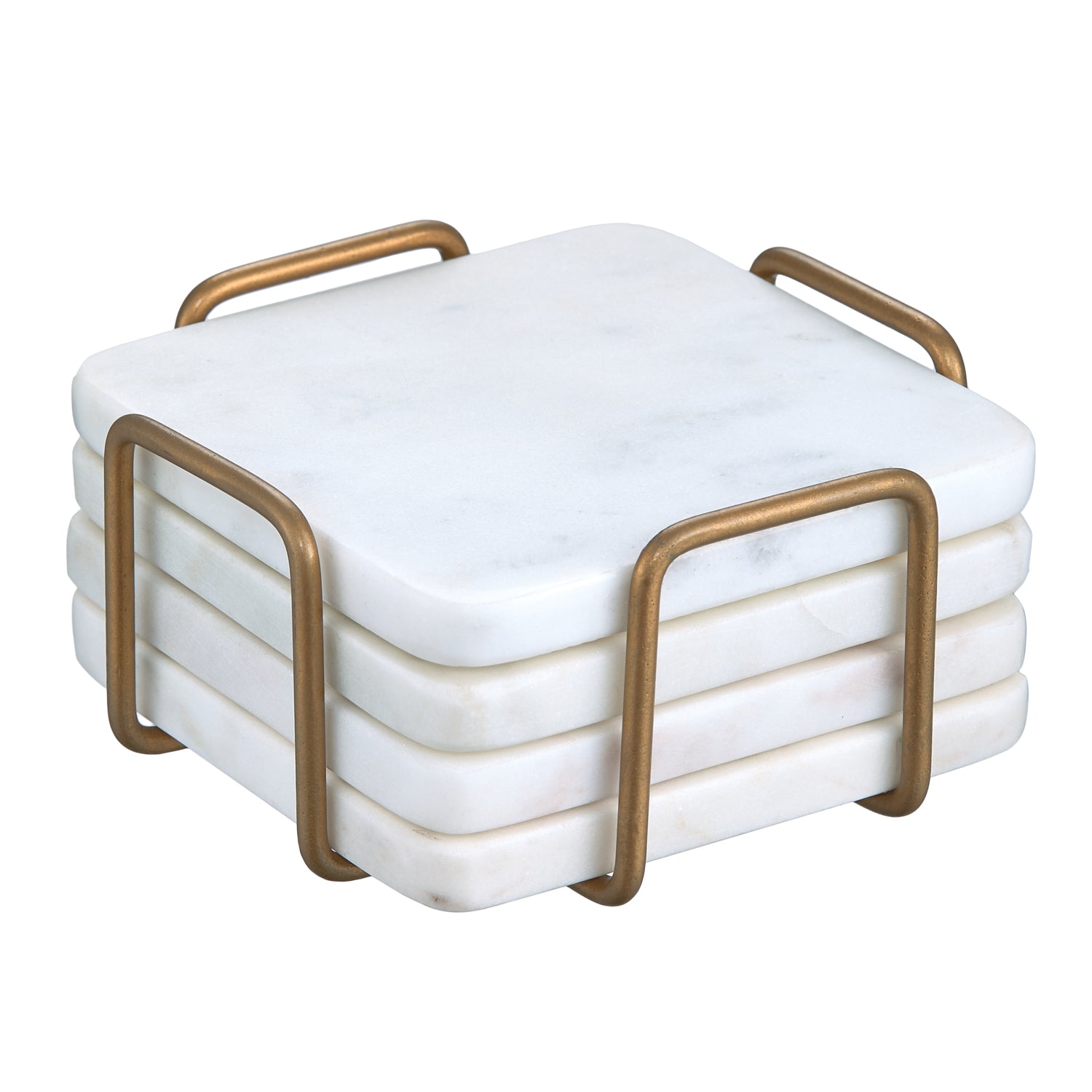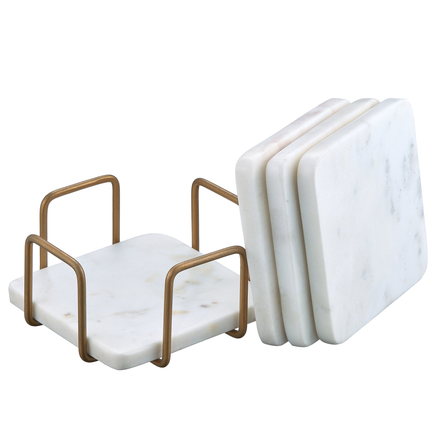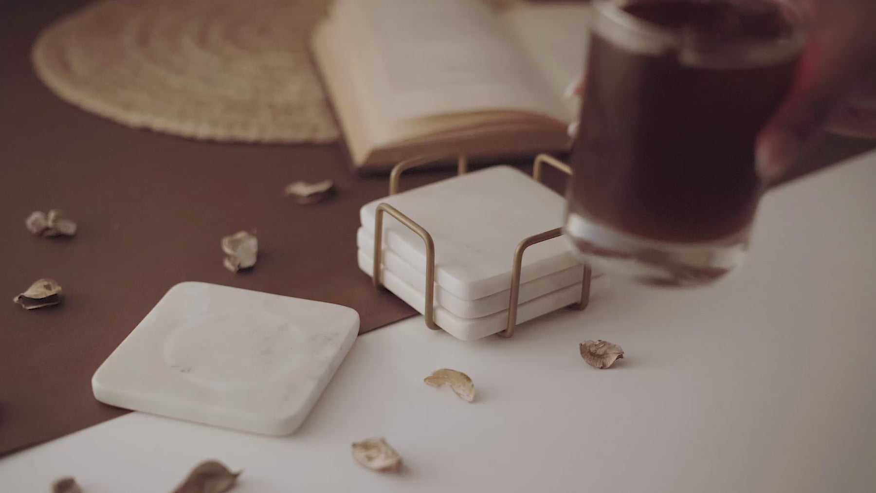 White Marble Coaster Set with Carnelian Gemstone Inlay Floral Art, Coasters for Coffee Table and Living Room