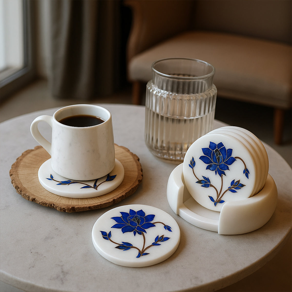 White Marble Coaster Set with Lapis Lazuli Gemstone Inlay Floral Art, Coasters for Coffee Table and Living Room