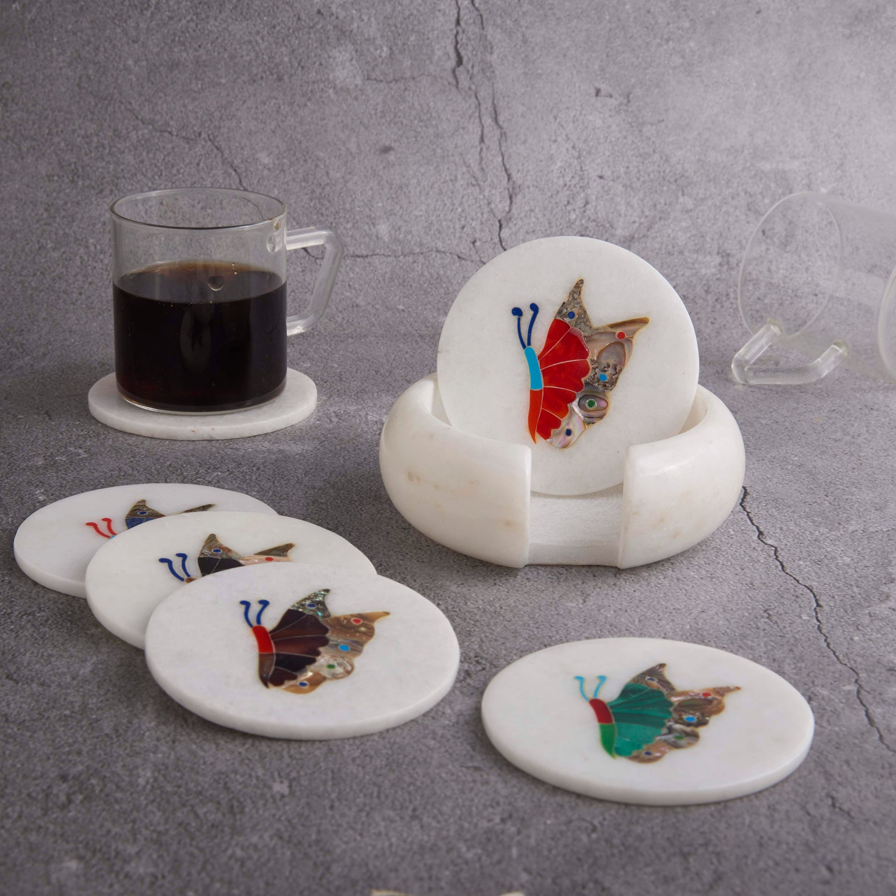 White Marble Coaster Set with Multi Color Gemstone Inlay Butterfly Art, Coasters for Coffee Table and Living Room